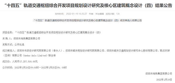 日前,經(jīng)深圳市地鐵集團(tuán)有限公司官網(wǎng)中標(biāo)公示通過,公司軌道交通院作為聯(lián)合體牽頭方參投的“‘十四五’軌道交通樞紐綜合開發(fā)項(xiàng)目規(guī)劃設(shè)計(jì)研究及核心區(qū)建筑概念設(shè)計(jì)(四)”喜獲中標(biāo),中標(biāo)金額人民幣1700余萬元。