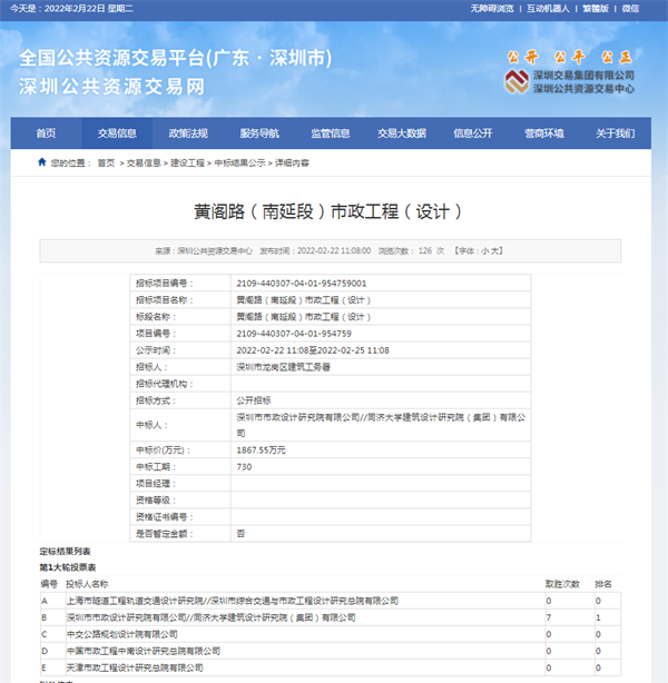 2022年2月22日,經(jīng)深圳市公共資源交易中心中標公示通過,深圳市政院與同濟大學(xué)建筑設(shè)計研究院(集團)有限公司(聯(lián)合體)在深圳市龍崗區(qū)建筑工務(wù)署黃閣路(南延段)市政工程(設(shè)計)項目公開招標中成功中標,中標金額為1867.55萬元。
