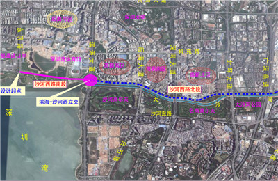 沙河西路位于深圳市南山區(qū),起點位于東濱路,終點至茶光路口,全長約7.43公里。按城市快速路標準建設,主線雙向6車道,主線設計車速60km/h,濱海-沙河西立交部分匝道設計車速50km/h,其余輔道及匝道設計車速30公里/小時。改造內(nèi)容包括:主車道和兩側輔道路面加鋪瀝青混凝土,完善全線輔道系統(tǒng)、主輔出入口及立交節(jié)點的改造優(yōu)化,新建人行過街天橋6座,延長現(xiàn)狀天橋1座,新增港灣式公交站6對,重新鋪設人行道板磚,更換現(xiàn)狀混凝土立道牙、完善交通及交通監(jiān)控設施以及完善相關市政管線設施等。