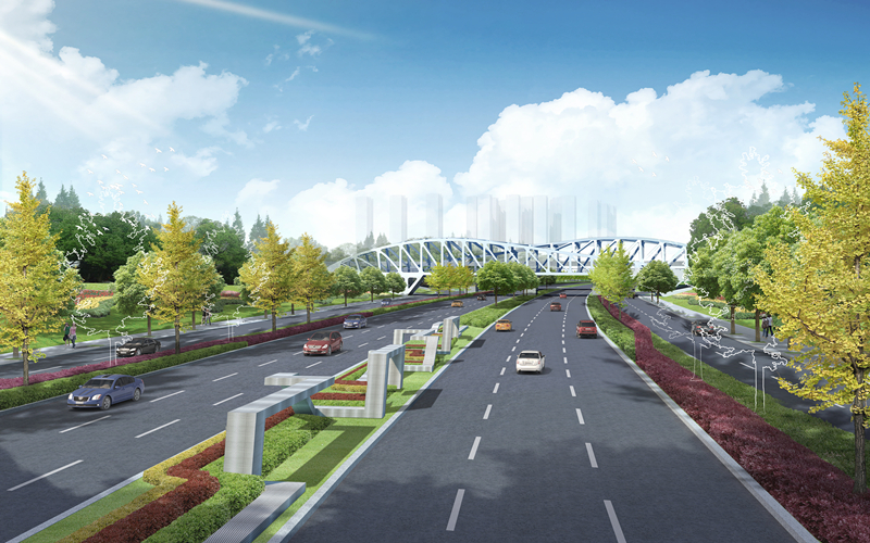 道路交通方案結(jié)合高新大道功能定位,區(qū)域發(fā)展需求,進(jìn)行全路段交通量預(yù)測(cè),合理的確定道路及相交節(jié)點(diǎn)方案。大力倡導(dǎo)綠色交通、改善公交出行環(huán)境,引導(dǎo)城市居民優(yōu)先采用慢行和公交方式出行;充分利用智能交通手段、有序分配道路交通資源,解決交通擁堵現(xiàn)狀,改善交通秩序;并以巧妙的手法解決了高新大道快速化改造后對(duì)光谷中心城區(qū)的分割影響。