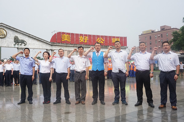 隨后在公明廣場,集團(tuán)黨委開展了“七·一”表彰暨新黨員入黨宣誓活動。集團(tuán)黨委隆重表彰了一年來涌現(xiàn)出的黨建工作先進(jìn)集體和個人,為獲獎代表頒發(fā)榮譽(yù)證書并合影留念。在集團(tuán)黨群工作部李湘楓部長的領(lǐng)誓下,全體黨員冒雨面對鮮紅的黨旗,用洪亮的聲音莊嚴(yán)宣誓,表明了自己為黨和國家奮斗終身的堅定決心。