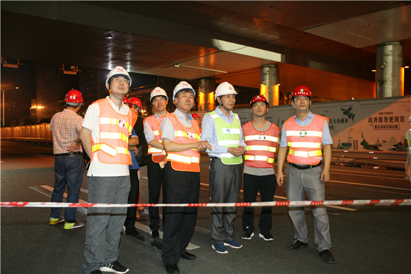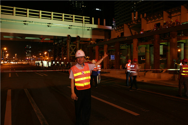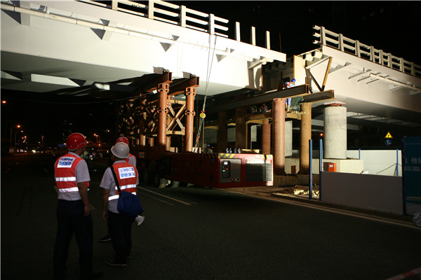 為保證架橋期間深南大道的交通連續(xù),施工采用夜間施工,選擇主線單邊雙向通行的交通疏解方案。采用SPMT模塊車架橋可以將傳統(tǒng)施工工藝7天的工期縮短為14小時左右,大大加快了整個架橋進(jìn)度,并且把對周邊環(huán)境和交通的影響降到了最低。橋梁架設(shè)期間,我公司副總經(jīng)理歐陽宇峰、橋梁總工王先前、市政四院副院長喬曉冉及項目組成員王延飛、孫志國等作為技術(shù)服務(wù)組全程提供技術(shù)支持。董事長陳宜言大師不辭辛苦,外地開會后晚間23:00趕回深圳,就直赴現(xiàn)場指導(dǎo)橋梁架設(shè)。