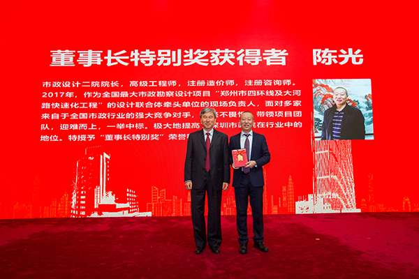陳宜言董事長(zhǎng)為市政設(shè)計(jì)二院院長(zhǎng)陳光頒發(fā)董事長(zhǎng)特別獎(jiǎng)