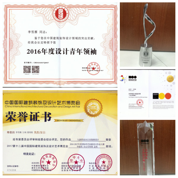 “中國(guó)建筑裝飾協(xié)會(huì)2016年度設(shè)計(jì)青年領(lǐng)袖”、“華鼎獎(jiǎng)金獎(jiǎng)”及“大中華區(qū)十佳設(shè)計(jì)師”獲獎(jiǎng)證書和獎(jiǎng)杯