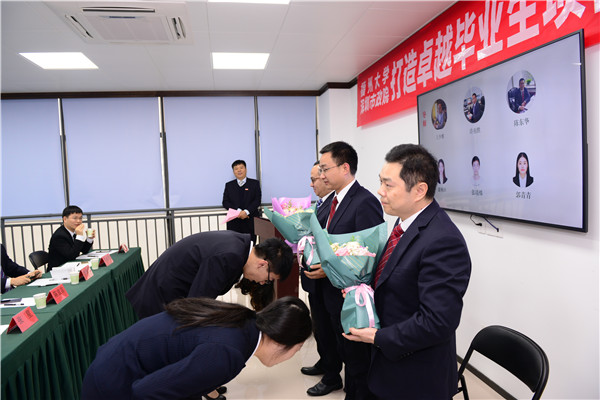 學生代表向陳宜言設(shè)計大師和張星副校長獻花。在領(lǐng)導們的見證下,學生們分別向各自的導師鞠躬行拜師禮。禮畢后,校企生代表上臺簽訂三方協(xié)議,我公司與福州大學完成學生交接。