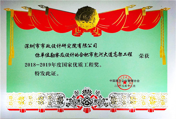 近日,由公司勘察設(shè)計(jì)的合肥市包河大道高架工程獲得2018-2019年度國(guó)家優(yōu)質(zhì)工程獎(jiǎng)。