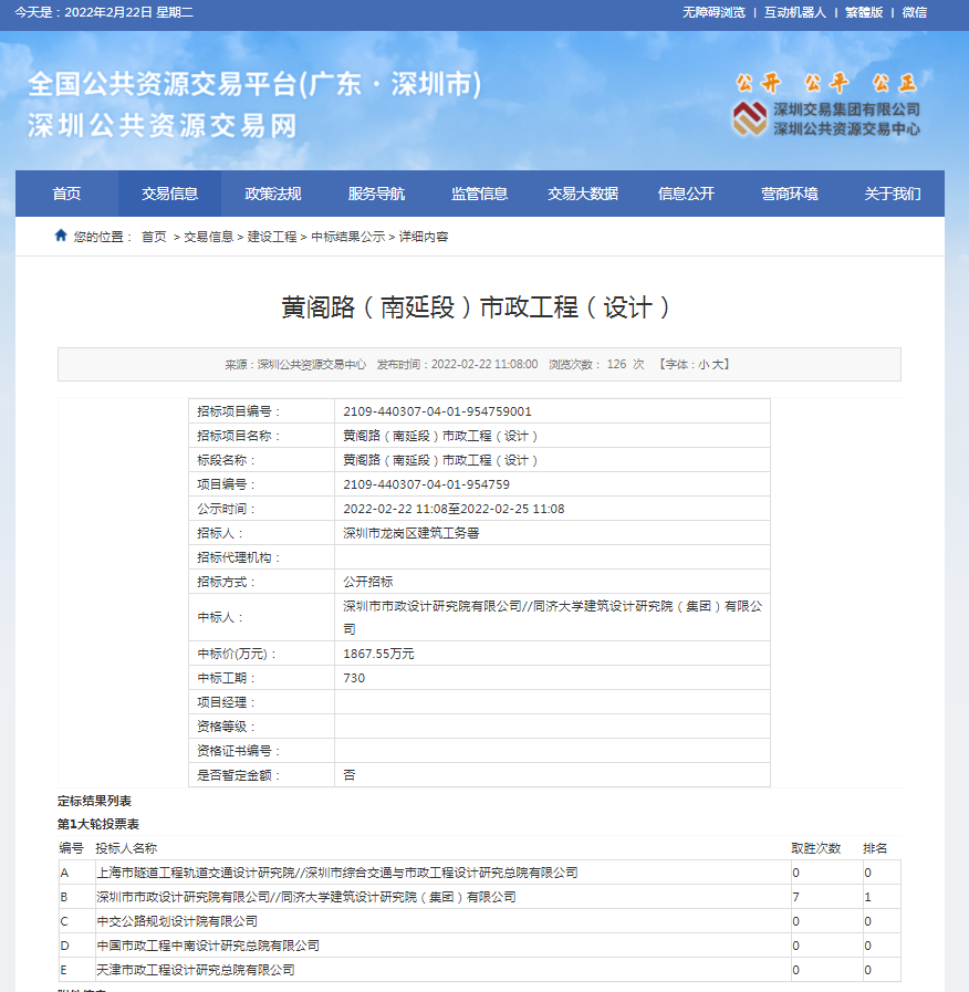 2022年2月22日,經(jīng)深圳市公共資源交易中心中標(biāo)公示通過,深圳市政院與同濟大學(xué)建筑設(shè)計研究院(集團)有限公司(聯(lián)合體)在深圳市龍崗區(qū)建筑工務(wù)署黃閣路(南延段)市政工程(設(shè)計)項目公開招標(biāo)中成...